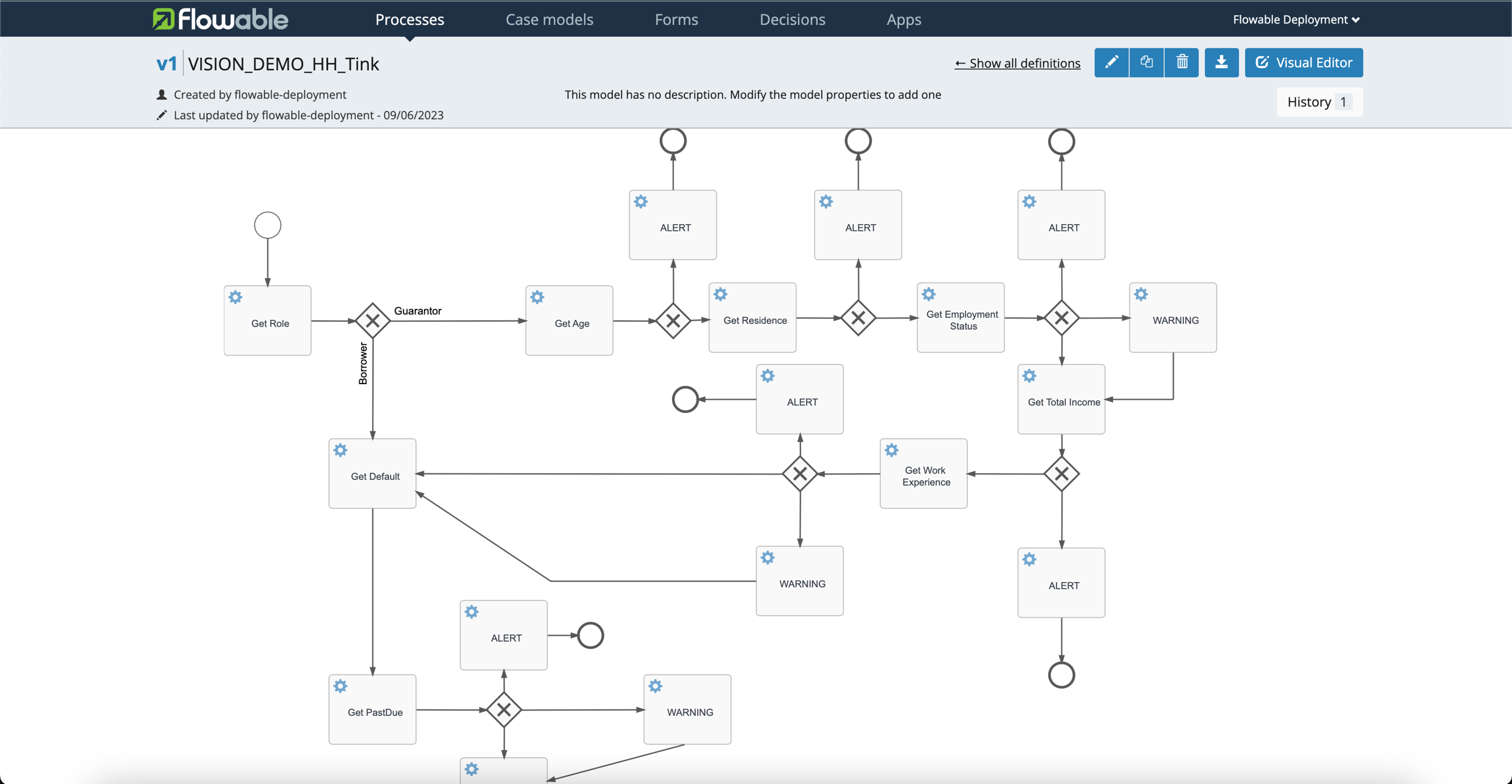Decision algorithms are set up using a specialized tool called Flowable: \