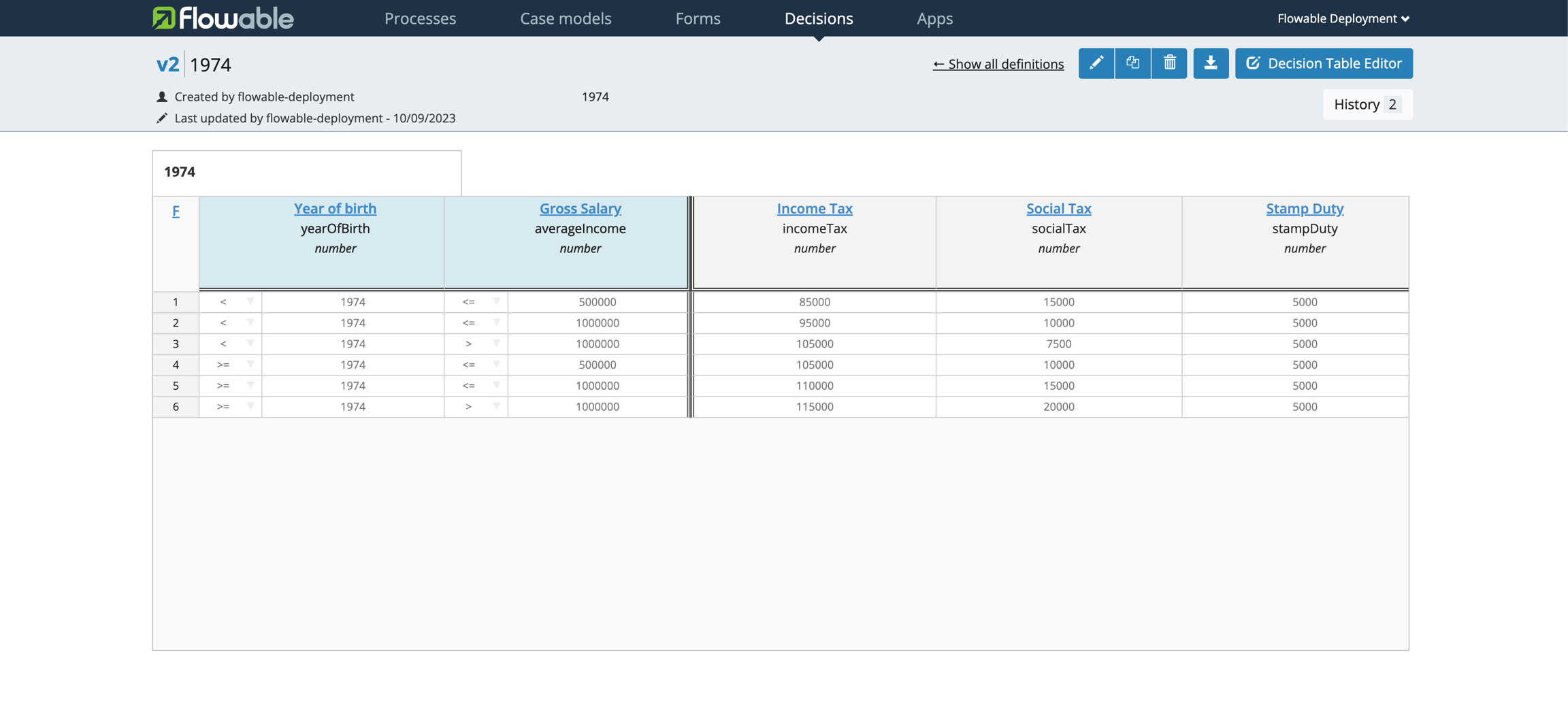 Flowable offers advanced features like Decision Tables, which enable the configuration of complex patterns and equations in a straightforward manner. A simple example might be calculating tax deductions based on a participant's birth year and income. For instance, a feature for grossAnnualIncome in timveroOS.